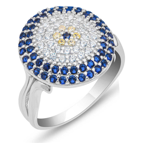 Silver Round Evil Eye Women's RingStylish designs suitable for all ages and lifestyles, a model that will accompany you at any moment of the day. The evil eye bead will add beauty to your beauty. It will also keep you away from evil eyes. This evil eye women's ring is made of 925 sterling silver. Rhodium plated silver. Rhodium plated silver women's ring models preserve their shine for a long time and oxidation is delayed. The stones on the ring are zircon. The silver round evil eye women's ring is produced by hand like other women's ring models. Due to silver and precious stones, there may be a ± 10% deviation in the average product weight.Ring Width: 2.00 cmRing Length: 2.20 cm Average Weight: 4 gr.