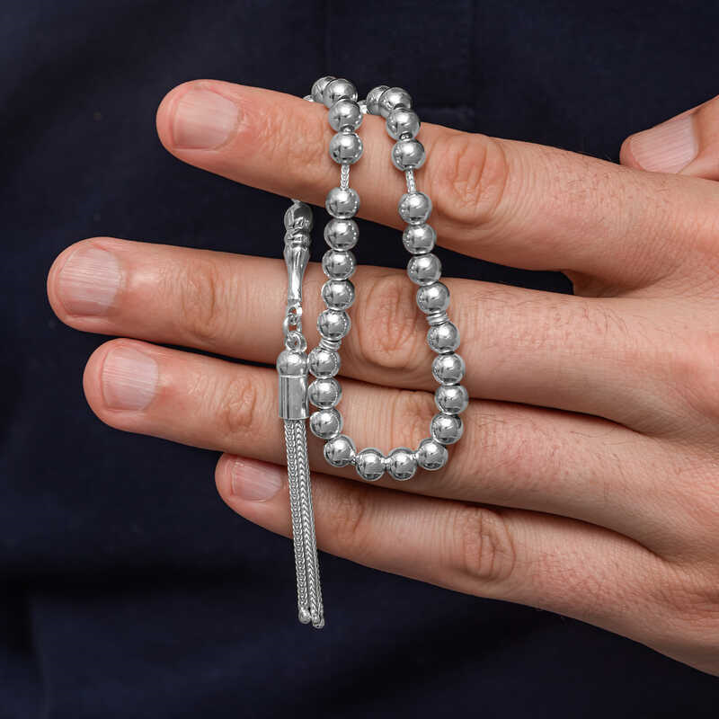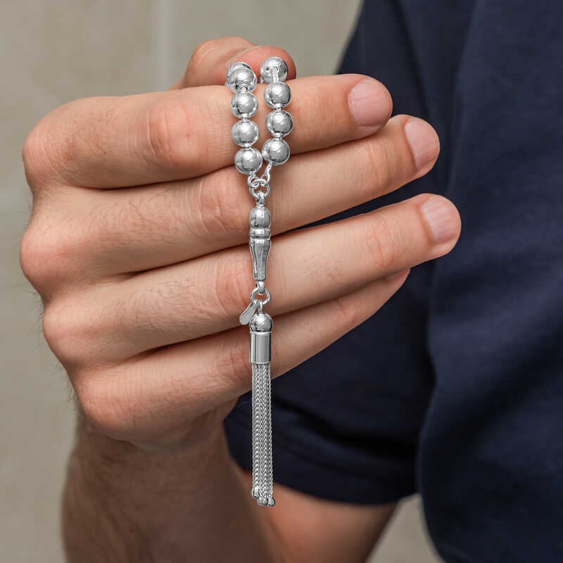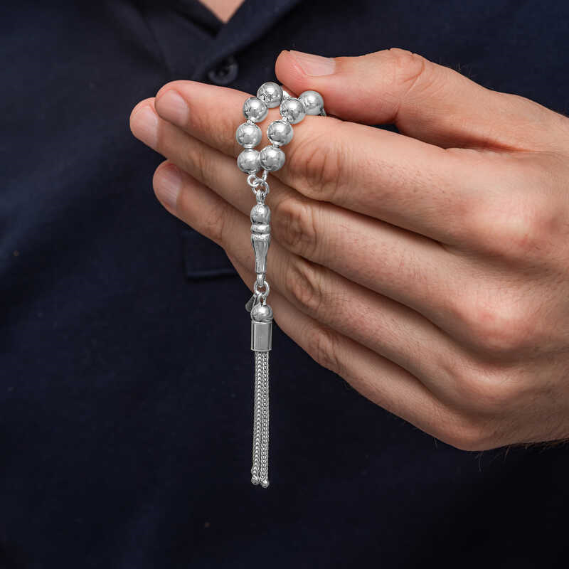 Silver Round Men's Prayer Beads This stylish silver prayer beads specially designed for men combine elegance and traditional texture with a modern line. Standing out with its shiny round grains and detailed workmanship, the prayer beads are made of 100% 925 sterling silver. It has a classic and timeless design that appeals to all age groups. You can enjoy using the silver prayer beads and choose them as a gift for birthdays, Valentine's Day, Father's Day or special occasions. All of our products are handmade. Due to silver and precious stones, there may be a ± 10% deviation in the average product weight. Width: 0.60 mm Length: 0.60 mm Prayer Length: 20.00 cm Average Weight: 25.00 Gr