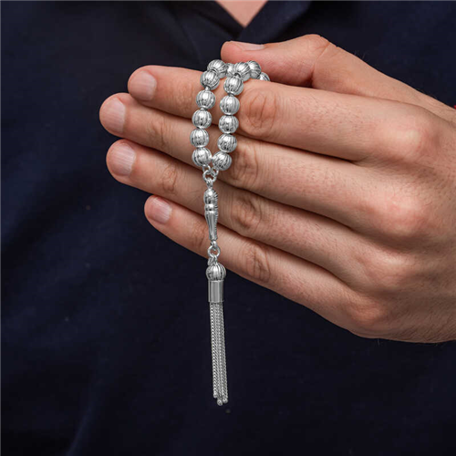Silver Round Striped Men's Prayer Beads Bringing together elegance and grace, the Silver Round Striped Men's Prayer Beads is a special accessory that blends modern and classic styles. Each carefully crafted bead with a round shape and striped details gives the prayer bead a sophisticated look. This special prayer bead made of 925 sterling silver offers long-lasting and high-quality use. The striped patterns on the bead surface add both tactile richness and visual depth to the prayer bead. The tassel detail completed by hand craftsmanship provides an aesthetic touch that completes the prayer bead. You can enjoy using the silver prayer beads and choose them as a gift for birthdays, Valentine's Day, Father's Day or special occasions. All of our products are handmade. There may be a ± 10% deviation in the average product weight due to silver and precious stones. Width: 0.50 mm Length: 0.50 cm Tasbeh Length: 20.00 cm Average Weight: 22.00 Gr