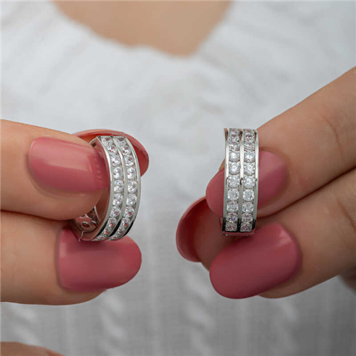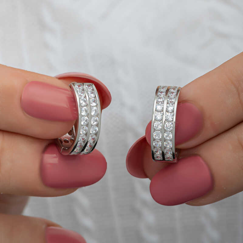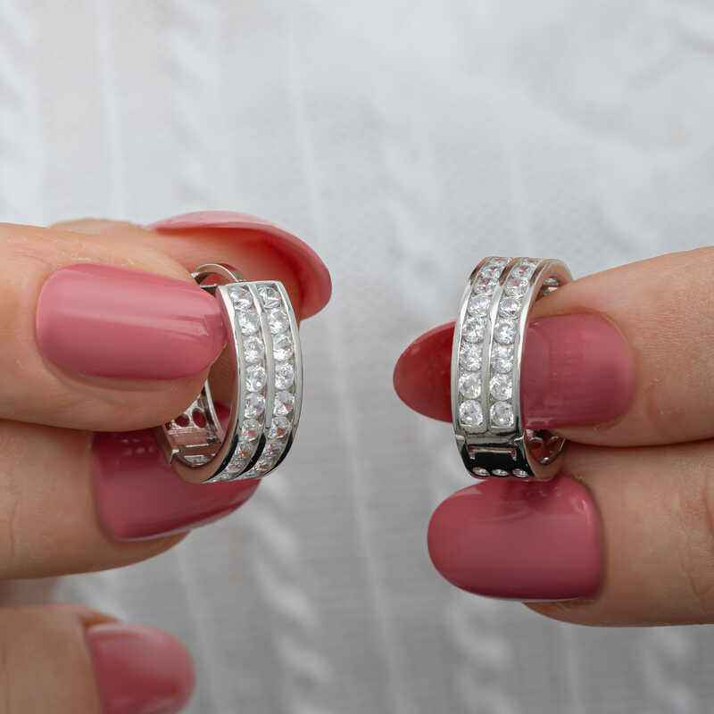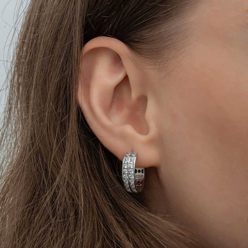 Silver Row of Stone Hoop Earrings for WomenThe gold row of stone hoop earrings, created with minimal fine lines that you can use in every aspect of life, are waiting for you to add sparkle and elegance to your outfits. Different trendy designs are released every year. This year's most popular models stand out as multi-stone products. You can add these stylish earrings to your jewelry box or consider them as a gift for a loved one. The stylish zircon stone hoop earrings are made of 925 sterling silver. Rhodium plated silver. Rhodium plated silver earrings preserve their shine for a long time and oxidation is delayed. The stones on them are zircon. Like all women's silver products, the silver row of stone hoop earrings are produced by hand. Due to silver and precious stones, there may be a ± 10% deviation in the average product weight.Earring Thickness: 0.60 cmEarring Diameter: 1.90 cmAverage Weight: 5 gr.