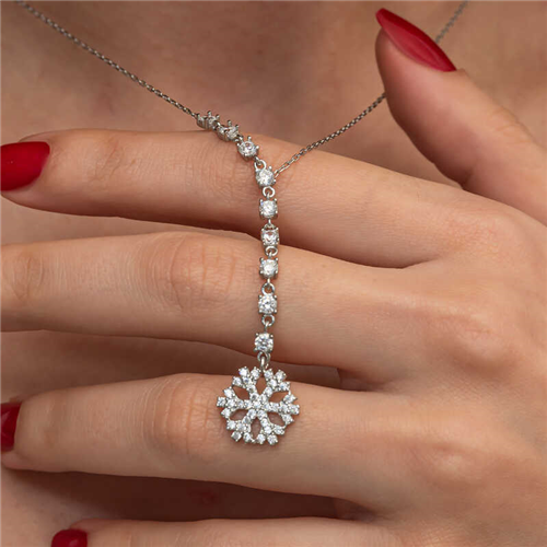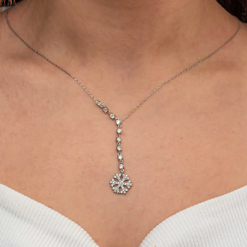 Silver Row Zircon Stone Snowflake Women's Necklace This elegant and stylish necklace reflects the magic of winter with its snowflake design. The fact that each snowflake is unique and has a different value, like women, is another feature that makes them special. It also symbolizes that people, just like snowflakes, can live happily without hurting each other. This stylish necklace is a perfect option for special occasions as a birthday gift, Valentine's Day gift or a gift for mothers. The necklace is made of 925 sterling silver. Rhodium plated silver women's necklace models preserve their shine for a long time and oxidation is delayed. The average chain length is 45 cm. Like all silver women's necklace models, this silver snowflake women's necklace is also entirely handmade. Due to silver and precious stones, there may be a ± 10% deviation in the average product weight. Snowflake Diameter: 1.20 cm Length: 6.50 cm Average Weight: 2.80 gr. Chain Length: 45.00 cm