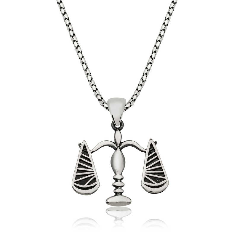 Silver Scales of Justice Necklace "Libra" symbolizes justice and the balanced distribution of rights. Scales of Justice necklace; Made of 925 sterling silver. Oxidized silver is coated. Oxidized silver gives the silver an aged appearance. The average chain length is 55 cm. As with all necklaces, this silver scales of justice necklace model is also produced entirely by hand. Width: 2.80 cm Length: 2.50 cm Avg. Weight: 10.50 gr