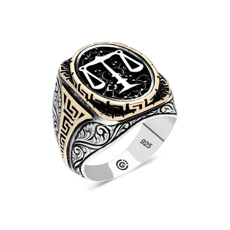Silver Scales of Justice Oval Men's Ring The oval scales of justice men's ring model on silver is a stylish accessory that you can use at any time of the day. You can gift this ring to yourself or your loved ones on your birthday, Father's Day or special occasions. The scales of justice men's ring model is made of 925 sterling silver. Oxide coating is applied to the silver. Oxide coating preserves its shine for a long time. Like all men's rings, the silver scales of justice men's ring model is handmade. Due to silver and precious stones, there may be a ± 10% deviation from the average product weight.Width: 1.50 cmLength: 2.00 cmAverage Weight: 16 gr.