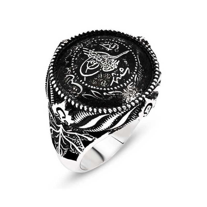 Silver Seal Men's RingTuğra means the signature of the Ottoman sultans. Each seal expresses the name, existence, and reign of the sultan to whom it belongs. The seal symbol has survived to the present day in many forms, different for each sultan. The seal was preserved in every period of the Ottoman Empire and never lost its importance. Over time, it has also held an important place in our calligraphy and is artistically kept alive by calligraphers today. You can enjoy using this silver ring that reflects this art and gift it to your loved ones. The Seal Men's Ring Model is made of 925 sterling silver. The silver is oxidized. Like all silver men's rings, the silver seal men's ring model is produced entirely by hand. Due to silver and precious stones, there may be a ± 10% deviation from the average product weight.Average Weight: 15.00 gr.
