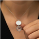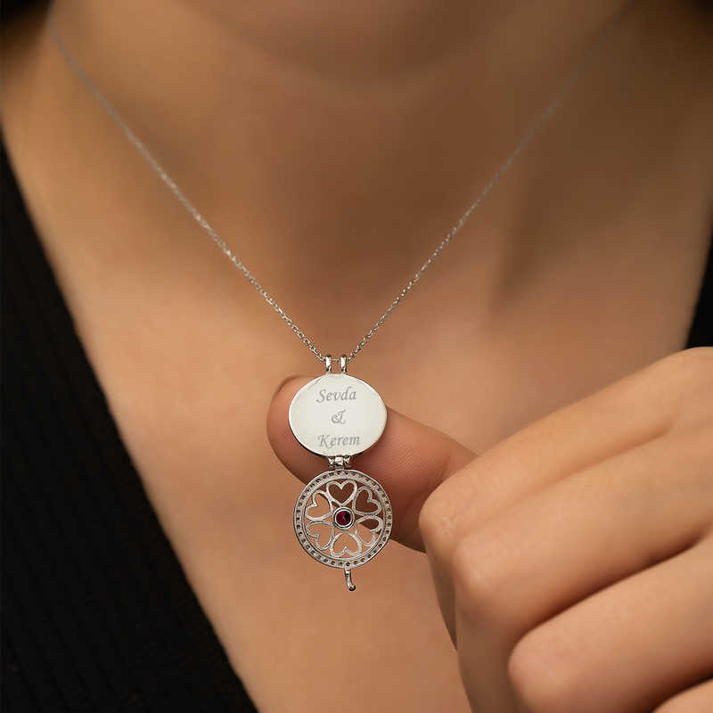 Silver Secret Love Necklace A secret love necklace with your names written within a circle of hearts that will always remind you of your love and your first moment of happiness and accompany your most romantic moments will be one of the most meaningful gifts you can give to your loved one with whom you expect a long relationship. This personalized women's necklace with your names written within a circle of hearts is made of 925 sterling silver. Rhodium plated silver. Rhodium plated silver women's necklace models preserve their shine for a long time and oxidation is delayed. The stones on the necklace are zircon. The average chain length is 45 cm. This specially designed secret love women's necklace is handmade. Due to silver and precious stones, there may be a ± 10% deviation in product weight. Width: 1.60 cm Length: 1.80 cm Average Weight: 3.28 gr.