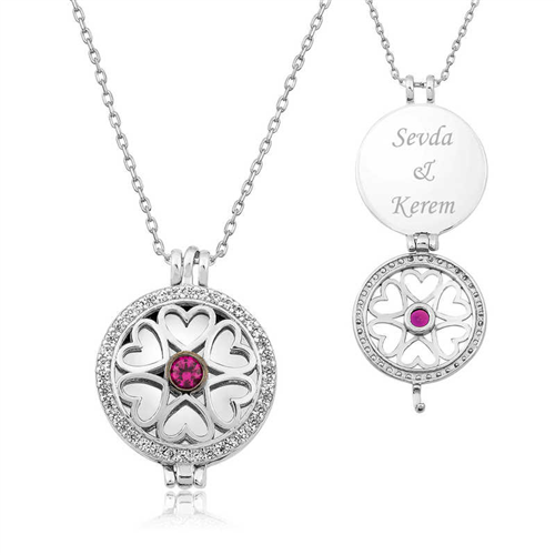 Silver Secret Love Necklace A secret love necklace with your names written within a circle of hearts that will always remind you of your love and your first moment of happiness and accompany your most romantic moments will be one of the most meaningful gifts you can give to your loved one with whom you expect a long relationship. This personalized women's necklace with your names written within a circle of hearts is made of 925 sterling silver. Rhodium plated silver. Rhodium plated silver women's necklace models preserve their shine for a long time and oxidation is delayed. The stones on the necklace are zircon. The average chain length is 45 cm. This specially designed secret love women's necklace is handmade. Due to silver and precious stones, there may be a ± 10% deviation in product weight. Width: 1.60 cm Length: 1.80 cm Average Weight: 3.28 gr.