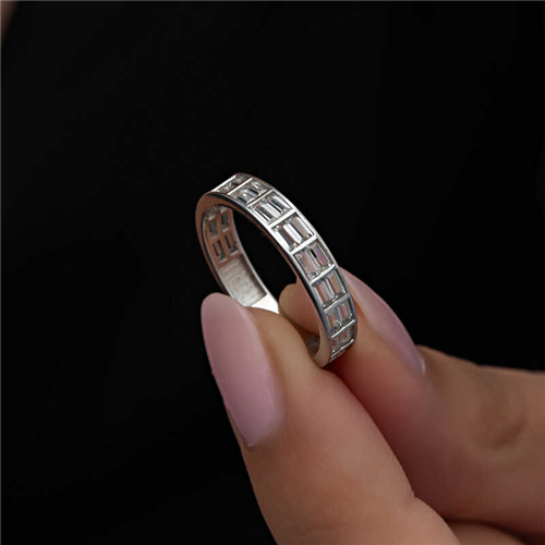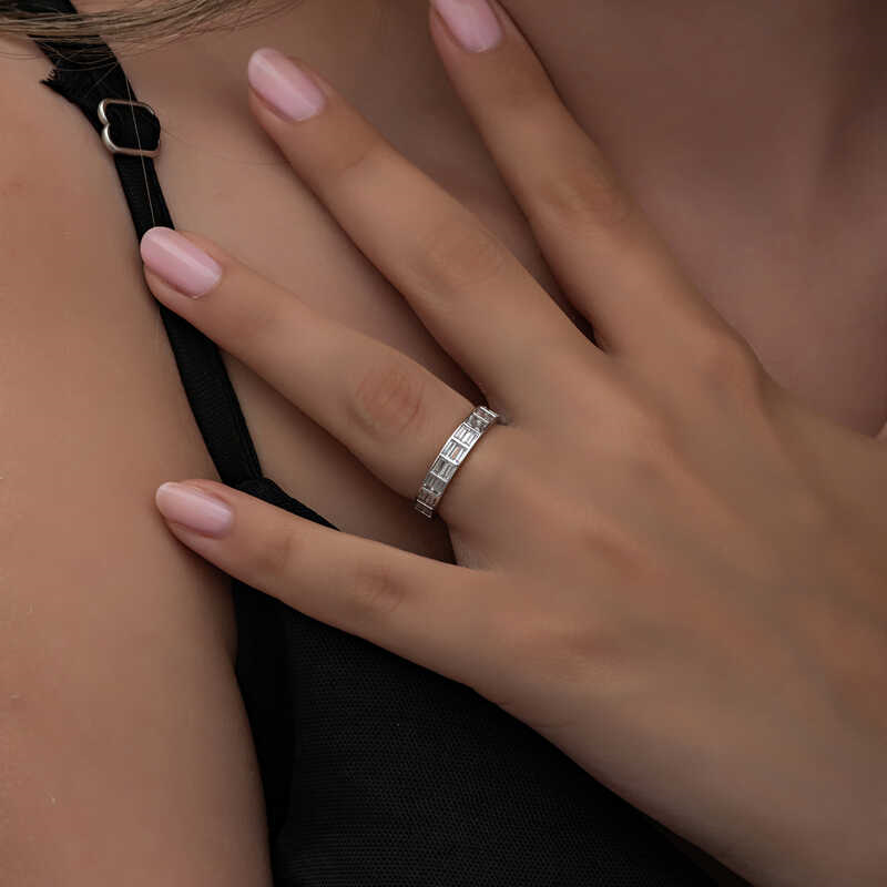Silver Row Baguette Stone Women's RingThis stylish ring model adorned with sparkling baguette stones is a very elegant option that you can choose on special occasions as a birthday gift, Valentine's Day gift or a gift for mothers. This half-tower shaped ring is made of 925 sterling silver. Rhodium plated silver. Rhodium-plated silver rings preserve their shine for a long time and oxidation is delayed. The stones on it are baguettes. As with all women's silver rings, the silver row baguette stone women's ring model is also handmade. Due to silver and precious stones, there may be ± 10% deviation in the average product weight.Width: 2.10 cmLength: 2.20 cmAvg. Weight: 2.30 gr.