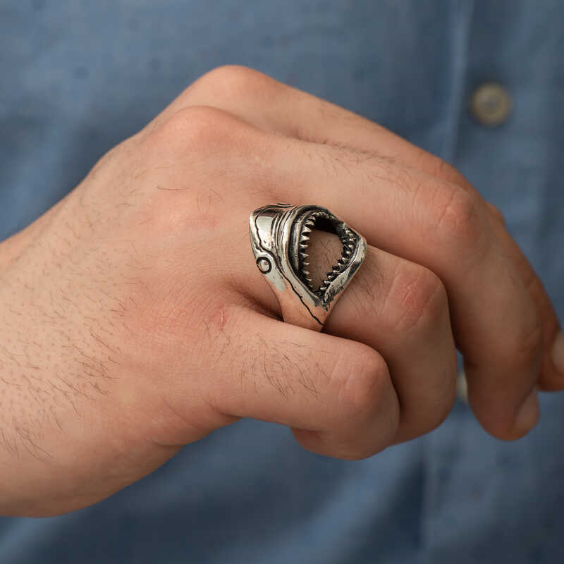 Silver Shark Men's Ring For different civilizations, fish have been representatives of life and water. Their meaning has been enriched with each period. Each succeeding society has found a richer meaning for fish. While the Native Americans believed that fish symbols bring long life, the Chinese symbolized prosperity and abundance. Fish accessories have found their place among accessory models as a result of this richness. Sharks are particularly meaningful as predatory and fearsome symbols. They are also associated with the king of the seas. You can buy this stylish ring for yourself or gift it to your loved ones on special occasions. This perfectly designed ring is made of 925 sterling silver. The silver is oxidized. Like all silver products, the silver shark ring is entirely hand-crafted. Due to silver and precious stones, there may be a ± 10% deviation in the average product weight. Width: 2.00 cm Length: 2.50 cm Average Weight: 13.63 gr.