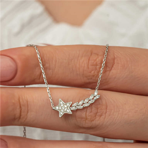 Silver Shooting Star Women's Necklace Reminiscent of the bright shine of the night, the star symbolically represents the infinity of the universe, a point in the distance. It is the symbol of shine, light, illumination and hope. Every person is special, every loved one is unique. How about making your loved ones happy with the silver shooting star women's necklace, the symbol of unique love and lifelong togetherness... The necklace is made of 925 sterling silver. Rhodium plated on silver. Rhodium plated silver necklaces preserve their shine for a long time and delay oxidation. The white stones on it are zircon. Like all silver women's necklace models, the silver shooting star women's necklace model is also produced by hand. Due to silver and precious stones, there may be a ± 10% deviation in the average product weight. Width: 2.00 cm Length: 0.80 cm Average Weight: 1.85 gr. Chain Length: 45.00 cm