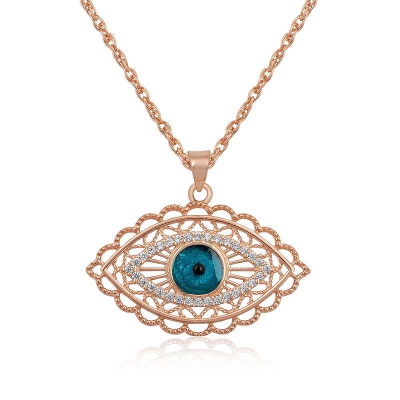 Silver Shuttle Evil Eye Women's Necklace The shuttle evil eye silver necklace, which will accompany you at every moment of the day and complete your outfits, will be an accessory that will add elegance to your elegance. This stylish necklace is a perfect option for a birthday gift, Valentine's Day or special occasions. The necklace is made of 925 sterling silver. The stones on it are zircon. Rose gold plated on silver. Rose gold plated products give the silver a pink copper color. Like other necklaces, the silver shuttle evil eye necklace is also handmade. Due to silver and precious stones, there may be ± 10% deviation in the average product weight. Width: 3.00 cm Length: 1.80 cm Avg. Weight: 3.30 gr.