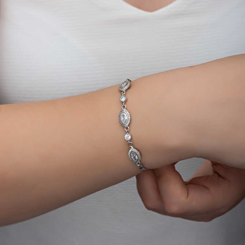 Silver Shuttle Zircon Stone Women's BraceletThe bracelet models offered to you in a wide range, from traditional and flashy motifs to simple designs, manage to attract the appreciation of women of all styles. You can have wrist models that will achieve an elegant and at the same time stylish look, and manage to stand out in any environment, suitable for classic or sporty clothing. By examining the bracelet models offered to you with a wide model options, you can own silver jewelry that you can wear for a long time. Our bracelet models that you can also give as a gift to your loved ones on special occasions are waiting for you. Silver shuttle zircon stone women's bracelet is made of 925 sterling silver. This bracelet is rhodium plated. Rhodium plated products preserve their shine for a long time, turning the silver into rhodium color. The stones on the bracelet are zircon. Like all silver women's bracelet models, the silver shuttle zircon stone women's bracelet model is also handmade. Due to silver and precious stones, there may be a ± 10% deviation from the average product weight.Bracelet Shuttle Width: 0.70 cmBracelet Shuttle Length: 1.20Bracelet Length: 21.00 cmAverage Weight: 5.70 gr.