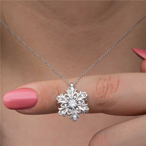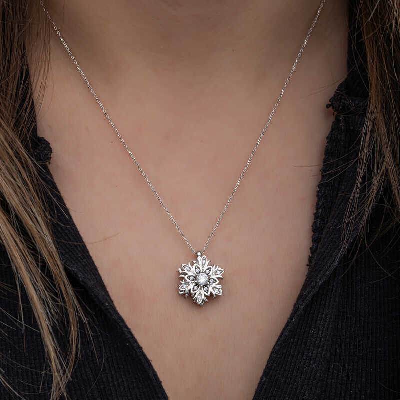 Silver Snowflake Rotating Stress Women's Necklace The sparkle and clarity of women are specially designed to resemble snowflakes. The fact that each snowflake is unique and has a different value, like women, is another feature that makes them special. Their nobility has managed to attract attention in every period. In addition, it symbolizes that people can live happily without hurting each other, just like snowflakes. This stylish necklace is a perfect option for a birthday gift, a Valentine's Day gift or a gift for mothers on special occasions. The necklace is made of 925 sterling silver. Rhodium plated silver women's necklace models preserve their shine for a long time and oxidation is delayed. The average chain length is 45 cm. Like all silver women's necklace models, this silver snowflake rotating stress women's necklace is also entirely handmade. Due to silver and precious stones, there may be a ± 10% deviation in the average product weight. Snowflake Diameter: 1.70 cm Chain Length: 45 cm Average weight: 4.20 gr