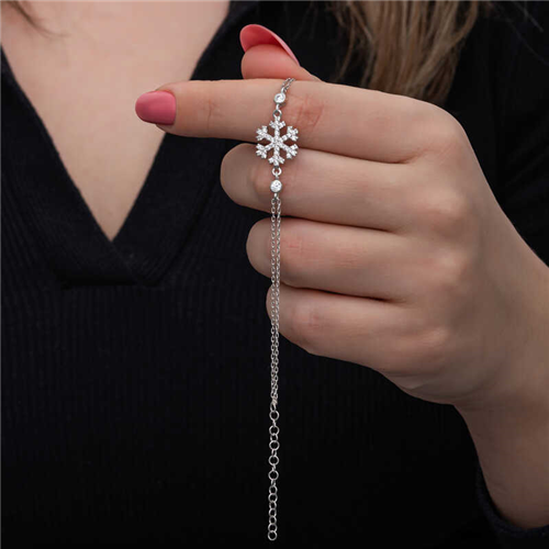 Silver Snowflake Women's Bracelet The shine and clarity of women have been specially designed to resemble snowflakes. The fact that each snowflake is unique and has a different value, like women, is another feature that makes them special. The nobility of the snowflake has managed to attract attention in every period. Additionally, it symbolizes that people, just like snowflakes, can live happily without hurting each other. This stylish bracelet is a perfect option for a birthday gift, a Valentine's Day gift or a gift for mothers on special occasions. The bracelet is made of 925 sterling silver. Rhodium plated silver. Rhodium plated products preserve their shine for a long time and oxidation is delayed. Like all silver bracelets, this silver rhodium snowflake women's bracelet is entirely handmade. Due to silver and precious stones, there may be a ± 10% deviation in the average product weight. Snowflake Diameter: 1.40 cm Chain Length: 19.00 cm Average Weight: 3.00 gr.