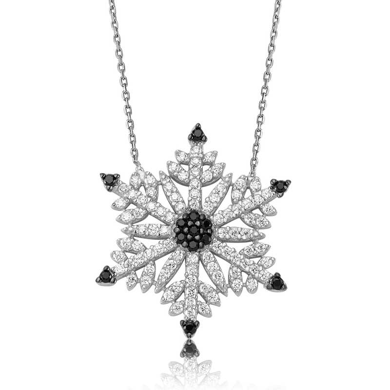 Silver Snowflake Women's Necklace The sparkle and clarity of women are specially designed to resemble snowflakes. The fact that each snowflake is unique and has a different value, like women, is another feature that makes them special. Their nobility has managed to attract attention in every period. In addition, it symbolizes that people, just like snowflakes, can live happily without hurting each other. This stylish necklace is a perfect option for special occasions as a birthday gift, Valentine's Day gift or a gift for mothers. The necklace is made of 925 sterling silver. Rhodium plated silver women's necklace models preserve their shine for a long time and oxidation is delayed. The average chain length is 45 cm. Like all silver women's necklace models, this silver snowflake women's necklace is also entirely handmade. Due to silver and precious stones, there may be a ± 10% deviation in the average product weight. Width: 2.50 cm Length: 2.50 cm Average weight: 4.30 gr