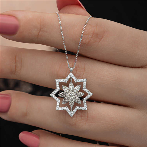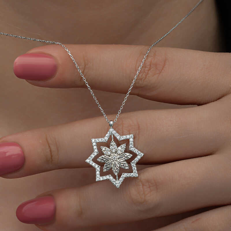 Silver Snowflake Women's Necklace The sparkle and clarity of women are specially designed to resemble snowflakes. The fact that each snowflake is unique and has a different value, like women, is another feature that makes them special. Their nobility has managed to attract attention in every period. In addition, it symbolizes that people, just like snowflakes, can live happily without hurting each other. This stylish necklace is a perfect option for special occasions as a birthday gift, Valentine's Day gift or a gift for mothers. The necklace is made of 925 sterling silver. Rhodium plated silver women's necklace models preserve their shine for a long time and oxidation is delayed. The average chain length is 45 cm. Like all silver women's necklace models, this silver snowflake women's necklace is also entirely handmade. Due to silver and precious stones, there may be a ± 10% deviation in the average product weight. Width: 2.10 cm Length: 2.40 cm Average weight: 3.10 gr