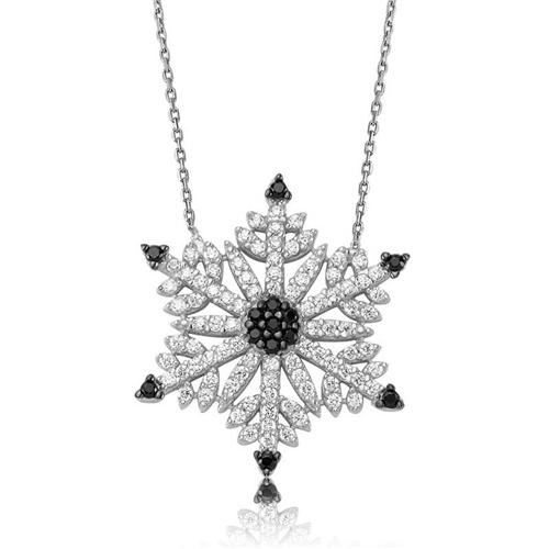 Silver Snowflake Women's Necklace The sparkle and clarity of women are specially designed to resemble snowflakes. The fact that each snowflake is unique and has a different value, like women, is another feature that makes them special. Their nobility has managed to attract attention in every period. In addition, it symbolizes that people, just like snowflakes, can live happily without hurting each other. This stylish necklace is a perfect option for special occasions as a birthday gift, Valentine's Day gift or a gift for mothers. The necklace is made of 925 sterling silver. Rhodium plated silver women's necklace models preserve their shine for a long time and oxidation is delayed. The average chain length is 45 cm. Like all silver women's necklace models, this silver snowflake women's necklace is also entirely handmade. Due to silver and precious stones, there may be a ± 10% deviation in the average product weight. Width: 2.50 cm Length: 2.50 cm Average weight: 4.30 gr