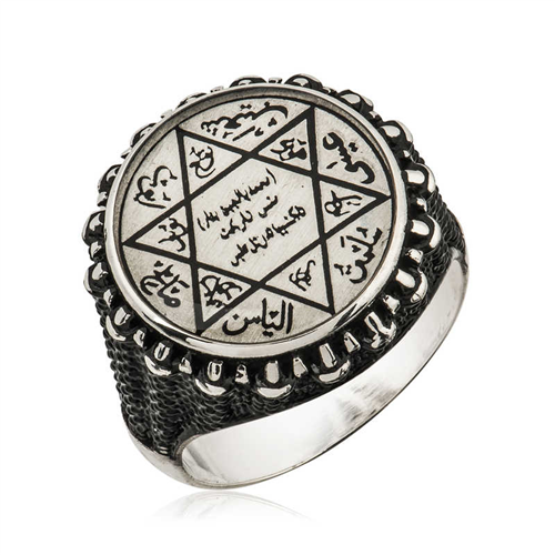Silver Solomon Prophet Seal Men's RingThe ring with this seal was used by Adam and left in Paradise when he came to this world. It was later brought to David by Gabriel with the permission of God Almighty. It was given to his son Solomon because he was worthy of it. First of all, it symbolizes the attributes of Majesty and Beauty of Almighty Allah. This seal is a symbol, a divine symbol. You can gift the Silver Solomon Seal Ring to your loved ones. Enamel and oxide coating is applied on silver. All of our products are handmade. Due to silver and precious stones, there may be a ± 10% deviation from the average product weight.Width: 2.00 cm. Length: 2.00 cm. Average Weight: 16.00 gr.