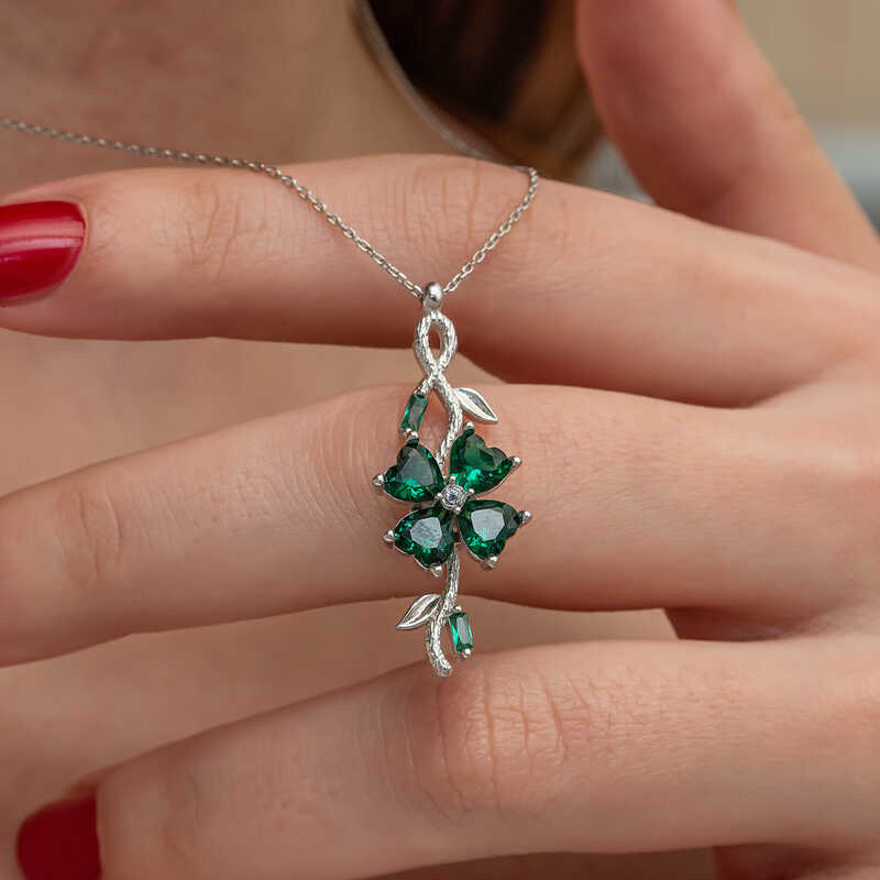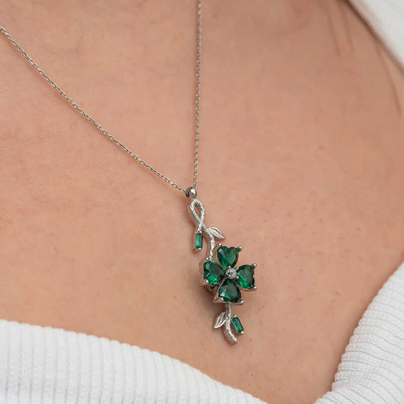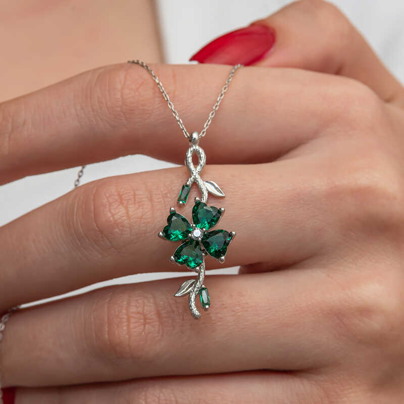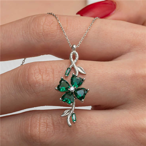 Silver Spinning Green Clover Women's Necklace Silver Spinning Green Clover Women's Necklace draws attention with its elegant design and stylish look. The clover motif, believed to bring luck, combined with natural green tones, makes it a perfect accessory for both daily and special occasions. Rhodium-plated silver. Rhodium-plated necklaces preserve their shine for a long time and oxidation is delayed. Like all silver women's necklace models, the silver clover necklace model is also handmade. Due to silver and precious stones, there may be ± 10% deviation in the average product weight. Clover Width: 1.00 cm Length: 3.00 cm Avg. Weight: 3.50 gr. Chain Length: 45.00 cm