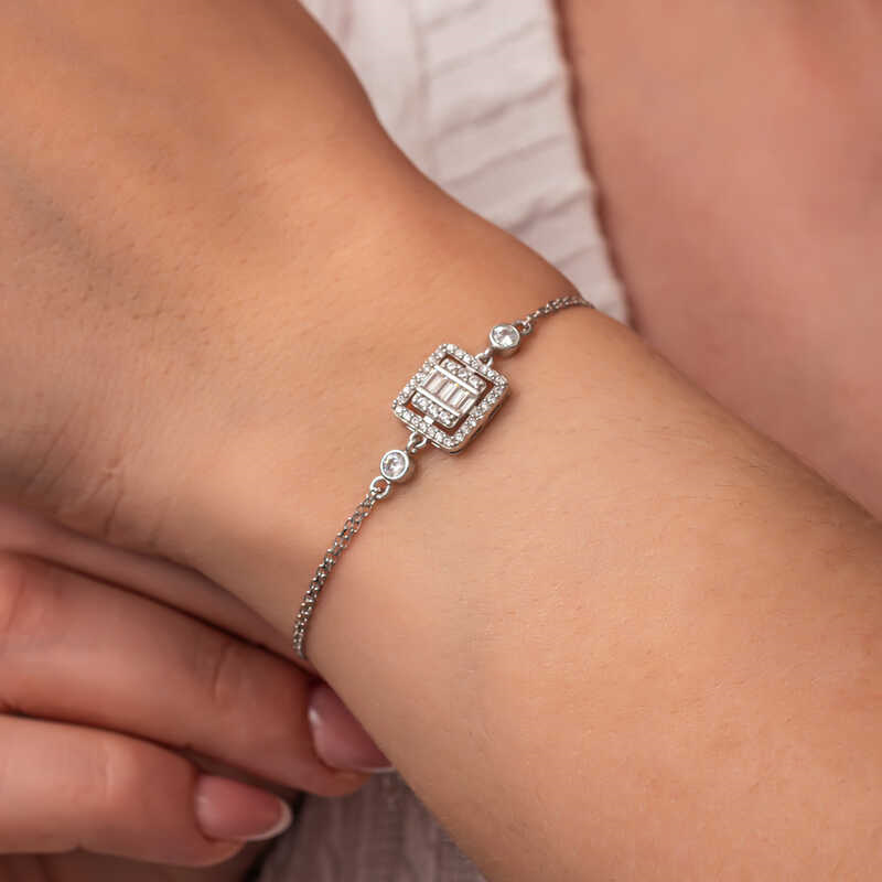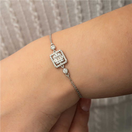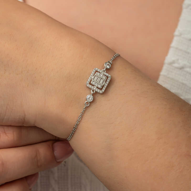 Silver Square Baguette Stone Women's Bracelet You can use the silver clover baguette bracelet models, designed in harmony with the fashion, in an elegant way both in your daily life and on special days and nights. You can complete your outfits with innovative products that appeal to the taste of women of all ages. With designs that each appeal to a different style, you can choose our models that suit your sporty, classic and alternative clothing styles. This stylish bracelet is a perfect option for a birthday gift, a Valentine's Day gift or on special occasions. Silver square baguette stone women's bracelet is made of 925 sterling silver. This bracelet is rhodium plated. Rhodium plated products preserve their shine for a long time and delay oxidation. Like all silver women's bracelet models, the silver square baguette stone women's bracelet model is also handmade. Due to silver and precious stones, there may be a ± 10% deviation in the average product weight. Width: 1 cm Length: 2.50 cm Bracelet length: 19.50 cm Average Weight: 2.40 gr.