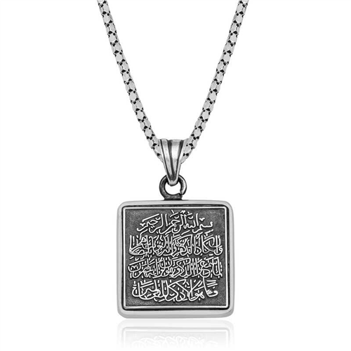 Silver Square Evil Eye Prayer Cevşen Necklace The evil eye means gaze, and every living thing can be affected by the evil eye. For protection from this evil eye disease and for healing, the evil eye prayer is recited. This highly spiritual necklace is a perfect option as a birthday gift, Valentine's Day gift on special occasions. The square evil eye prayer cevşen necklace model is made of 925 sterling silver. Oxidized silver is coated. Oxidized silver necklaces preserve their shine for a long time and tarnishing is delayed. Like all silver necklaces, the silver square evil eye prayer cevşen necklace is also handmade. Due to silver and precious stones, there may be a ± 10% deviation in the average product weight. Necklace Width: 2.00 cm Necklace Length: 3.10 cm Chain Length: 55.00 cm Average Weight: 13.00 gr