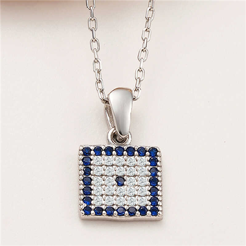 Silver Square Evil Eye Women's Necklace Various talismans have been used in many cultures to protect against the harms of bad energy. The talisman used in most Eastern cultures is the eye. The evil eye bead is inspired by the shape of the eye. The choice of blue color is no coincidence. Evil eye beads are mostly designed in blue due to the belief that people with colored eyes reflect their energy more effectively. You can gift this dazzling silver evil eye bead necklace to people you want to protect from the evil eye and to your loved ones. All of our products are handmade. Due to silver and precious stones, there may be ± 10% deviation in product weight. Width: 1.00 cm Length: 1.10 cm Avg. Weight: 2.50 gr.