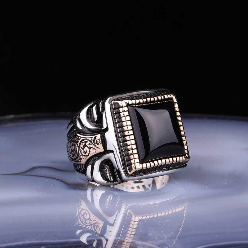 Silver Black Square Onyx Stone Men's RingThis men's ring model, made of onyx stone on silver, is a stylish accessory that you can use at any time of the day. You can gift this ring to yourself or your loved ones on your birthday, Father's Day or special occasions. The black square onyx stone men's ring model is made of 925 sterling silver. Oxide coating is applied to the silver. Oxide coating preserves its shine for a long time. As with all men's rings, the silver black square onyx stone men's ring model is produced by hand. Due to silver and precious stones, there may be a ± 10% deviation from the average product weight.Average Weight: 16.00 gr.