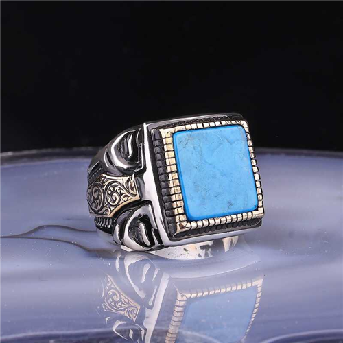 Silver Square Turquoise Stone Men's Ring This men's ring model, made of turquoise stone on silver, is a stylish accessory that you can use at any time of the day. You can gift this ring to yourself or your loved ones on your birthday, Father's Day or special occasions. Blue square turquoise stone men's ring model is made of 925 sterling silver. Oxidized silver is coated. Oxidized silver men's ring models preserve their shine for a long time. As with all men's rings, silver square turquoise stone men's ring model is also handmade. Due to silver and precious stones, there may be ± 10% deviation in the average product weight. Width: 1.70 cm Length: 1.70 cm Avg. Weight: 16.00 gr.