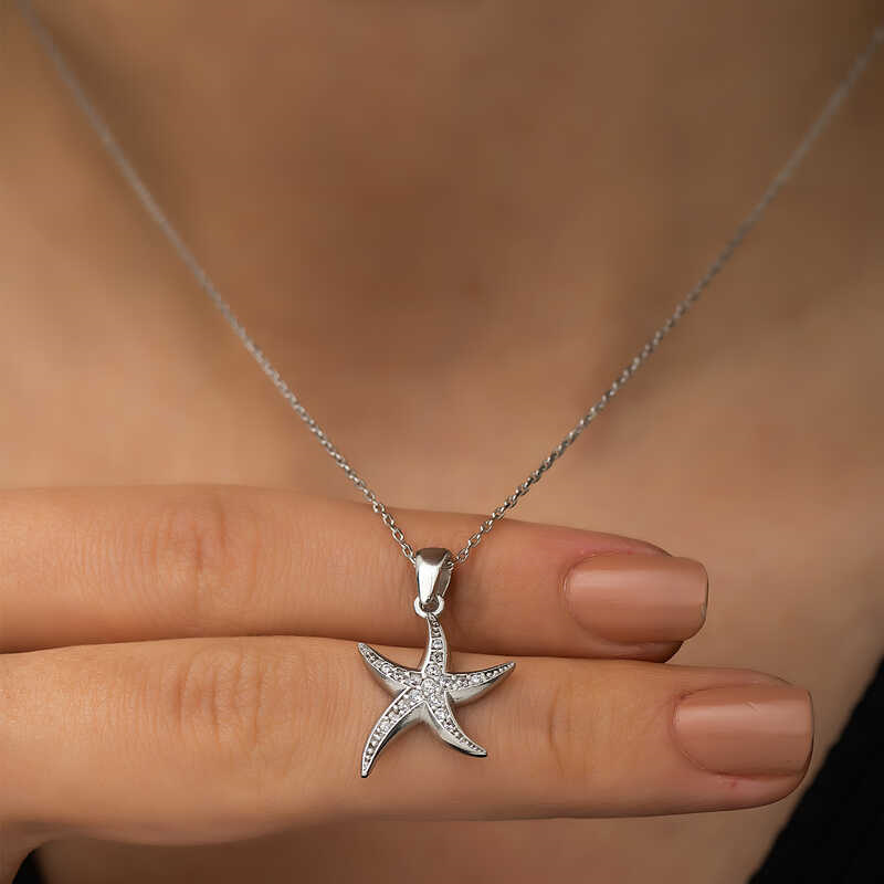 Silver Starfish Women's Necklace Starfish symbolizes divine love, divine guidance, inspiration, brightness, and hope. May your soul be filled with hope and love with the starfish that has fallen from the sky to the sea. The silver starfish necklace also reflects elegance and grace. You can choose this simple and stylish necklace, which has always been popular, as a birthday gift, Valentine's Day gift or a gift for mothers on special occasions. Starfish women's necklace is made of 925 sterling silver. Rhodium plating is applied to the silver necklace. Rhodium plating preserves its shine for a long time and delays oxidation. The average chain length is 45 cm. Like all silver women's necklace models, this silver starfish women's necklace is also entirely handmade. Due to silver and precious stones, there may be a ± 10% deviation in the average product weight. Width: 1.50 cm Length: 2.00 cm Average Weight: 3.00 gr.
