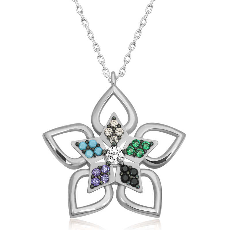 Silver Flower Necklace with Colored Stones The most special and elegant way to express your feelings to your loved ones is to send her stylish, colorful and fragrant flowers. Flowers, which are among the gifts to be given on special occasions, have been designed with a different interpretation this time. The flower necklace with color stones is waiting for those who want to express their love once again, for those who want to say "you are a flower." This specially designed flower necklace is made of 925 sterling silver. Rhodium plated silver. Rhodium plated silver women's necklace models preserve their shine for a long time and oxidation is delayed. The stones on the necklace are zircon. Like all women's silver necklace models, the silver flower necklace is produced by hand. Due to silver and precious stones, there may be a ± 10% deviation in the specified product weight. Width: 2.00 cm Length: 2.20 cm Average Weight: 2.70 Gr Chain Length: 45 cm