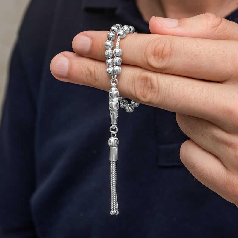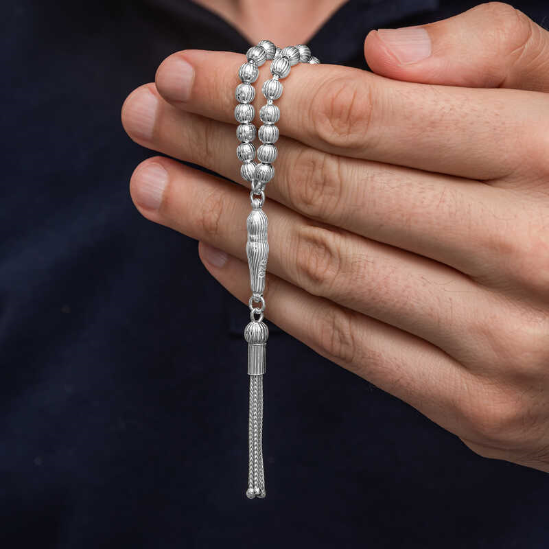 Silver Striped Round Men's Prayer Beads The Silver Striped Round Men's Prayer Beads, which stands out with its elegant and stylish design, combines traditional aesthetics and modern workmanship. Each bead of this prayer bead, decorated with striped details, is handcrafted and made of 100% 925 sterling silver. It is an ideal accessory for both daily use and special occasions. You can enjoy using the silver prayer beads and choose them as a gift for birthdays, Valentine's Day, Father's Day or special occasions. All of our products are handmade. Due to silver and precious stones, there may be a ± 10% deviation in the average product weight. Width: 0.40 mm Length: 0.50 mm Prayer Length: 16.00 cm Average Weight: 13.60 Gr