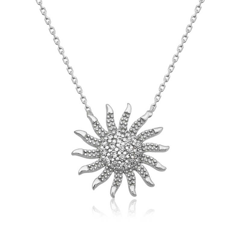 Silver Sun Necklace for Women The sun is the symbol of light, knowledge, goodness, power, and government. This dazzling necklace with its sparkling and distinctive design is made of 925 sterling silver. Rhodium plating is applied to the silver. Rhodium-plated silver products preserve their shine for a long time and oxidation is delayed. The stones on the silver-white stone sun lady necklace are zircon. Like all silver necklaces, the silver-white stone sun lady necklace is entirely handmade. Due to silver and precious stones, there may be ± 10% deviation in the average product weight. Width: 1.50 cm Length: 1.50 cm Weight: 2.30 gr.