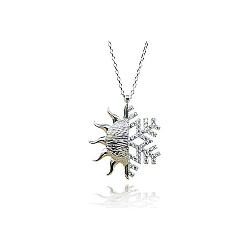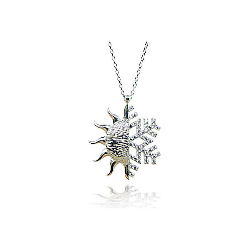 Silver Sun Snowflake Women's Necklace The sun is the symbol of light, knowledge, goodness, power, and management. This dazzling necklace with its sparkling and distinctive design is made of 925 sterling silver. Rhodium plating is applied to the silver. Rhodium-plated silver products preserve their shine for a long time and oxidation is delayed. The stones on the silver sun snowflake women's necklace are zircon. Like all silver necklaces, the silver sun women's necklace is entirely handmade. Due to silver and precious stones, there may be a ± 10% deviation in the average product weight. Width: 1.80 cm Length: 2.00 cm Average Weight: 2.60 gr.