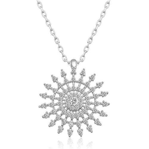 Silver Sun Necklace for Women The sun is the symbol of light, knowledge, goodness, power, and government. This dazzling necklace with its sparkling and distinctive design is made of 925 sterling silver. Rhodium plating is applied to the silver. Rhodium-plated silver products preserve their shine for a long time and oxidation is delayed. The stones on the silver white stone sun women's necklace are zircon. Like all silver necklaces, the silver sun women's necklace is entirely handmade. Due to silver and precious stones, there may be ± 10% deviation in the average product weight. Width: 1.80 cm Length: 1.80 cm Average Weight: 2.50 gr.