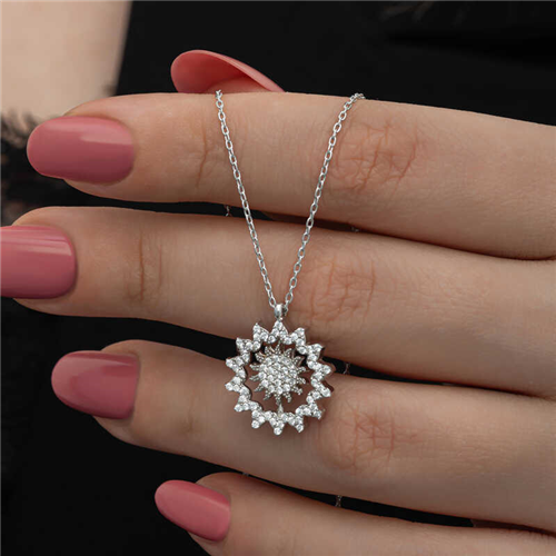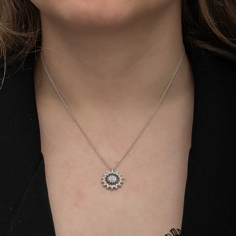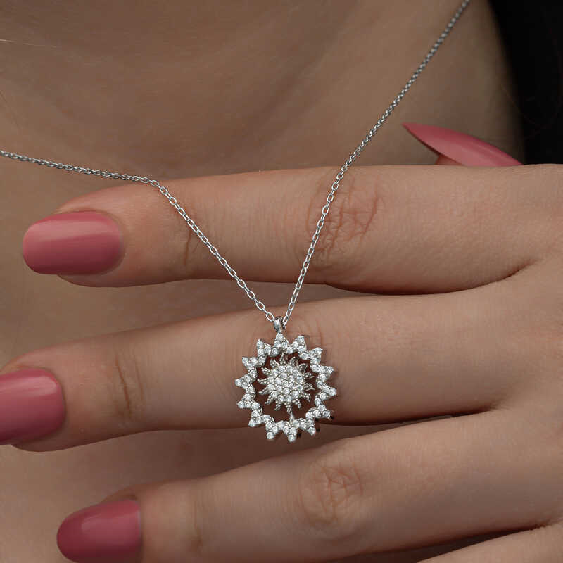 Silver Sun Necklace for Women The sun is the symbol of light, knowledge, goodness, power, and government. This dazzling necklace with its sparkling and distinctive design is made of 925 sterling silver. Rhodium plating is applied to the silver. Rhodium-plated silver products preserve their shine for a long time and oxidation is delayed. The stones on the silver white stone sun women's necklace are zircon. Like all silver necklaces, the silver sun women's necklace is entirely handmade. Due to silver and precious stones, there may be a ± 10% deviation in the average product weight. Necklace Diameter: 1.70 cm Chain Length: 45 cm Average Weight: 3.80 gr.