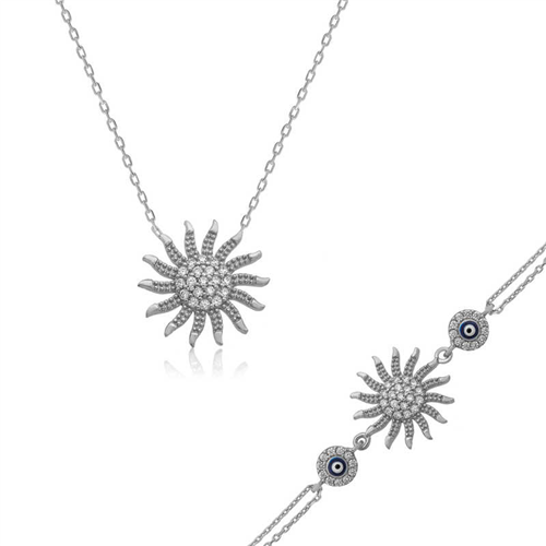 Silver Sun Women's SetThe sun is the symbol of light, knowledge, goodness, power, and governance. This dazzling duo set with its sparkling and distinctive design is made of 925 sterling silver. The silver is rhodium-plated. Rhodium-plated silver sets preserve their shine for a long time and oxidation is delayed. The stones on the silver sun women's set model are zircon. As with all silver sets, the silver white stone sun women's set model is produced entirely by hand. Due to silver and precious stones, there may be a ± 10% deviation in the average product weight.Piece Width: 1.50 cmPiece Length: 1.50 cmAverage Set Weight: 5.75 gr.