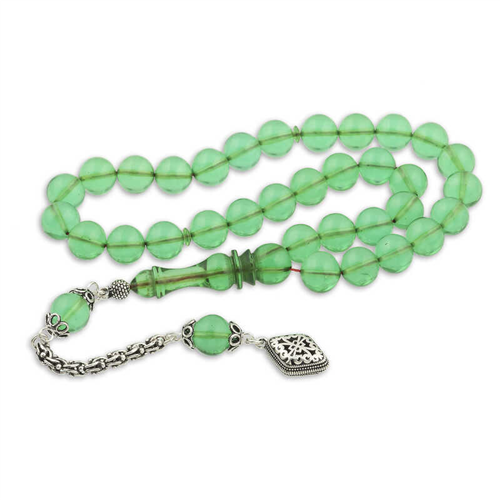 Silver Tassel Green Sphere Fire Amber Prayer Beads Fire amber is a natural stone formed from the resin of a special pine tree species and derives its color entirely from it. The orange and red amber has a rope-like appearance and air spaces within it, adding special value to the natural stone. This prayer bead, which is very compatible with fire and air signs, also offers significant health benefits. Fire amber's properties come into play, especially in cases of colds and fatigue. Activated by body heat, the natural stone concentrates magnetically and cleanses energy. Our country's distinguished prayer bead masters frequently craft this material to create various works of art. These prayer beads are also bought and sold by collectors. The silver tassel green sphere fire amber prayer bead is a very elegant prayer bead for everyday use. Prayer beads, an indispensable gift for special occasions, can be preferred as gifts for men on special occasions such as birthdays, Valentine's Day, and Father's Day. The green sphere fire amber prayer beads with silver tassels are made entirely by hand, as are other fire amber prayer beads. Width: 0.70 cm Length: 55 cm Average Weight: 24.70 GR