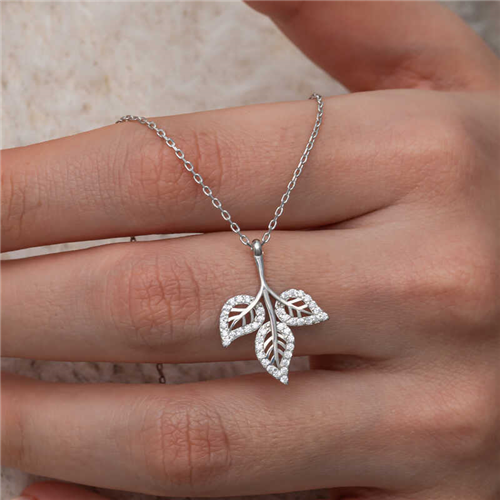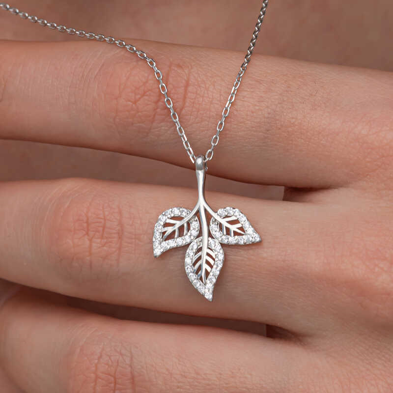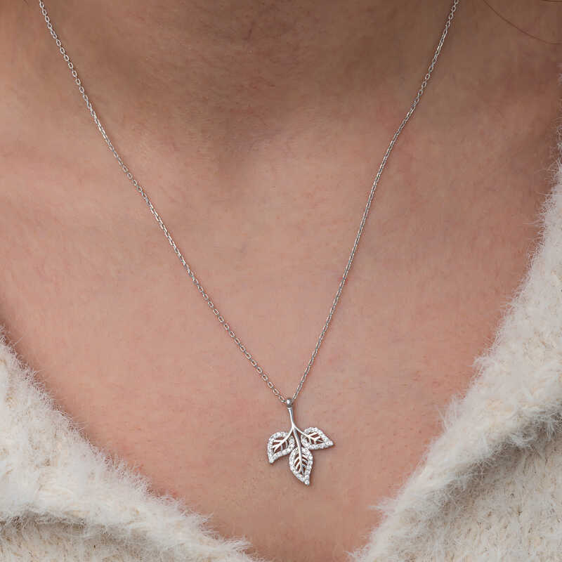 Silver Three Leaf Women's Necklace The silver three leaf women's necklace is often associated with themes of luck, love and protection. Leaves symbolize seasonal changes; especially the leaves falling in autumn are seen as a sign of change and renewal. In this context, a leaf necklace can symbolize new beginnings and personal transformations. This stylish necklace is a perfect option for a birthday gift, Valentine's Day or special occasions. The necklace is made of 925 sterling silver. The silver is rhodium plated. Due to silver and precious stones, there may be a ± 10% deviation from the average product weight. Width: 1.50 cm Length: 2.00 cm Avg. Weight: 2.50 gr. Chain Length: 45.00 cm