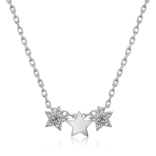Silver Three Star Necklace The star is an auspicious symbol believed to bring luck in many societies and teachings. It carries the energy of the Planet Venus. The Planet Venus is also the representative of the energy of love and romance. This stylish necklace is a perfect option for a birthday gift, Valentine's Day gift or a gift for mothers on special occasions. The silver three star women's necklace is made of 925 sterling silver. This necklace is rhodium plated. Rhodium plated silver women's necklace models preserve their shine for a long time. As with all our silver women's necklace models, the silver three star women's necklace model is handmade. Due to silver and precious stones, there may be a ± 10% deviation in the average product weight. Width: 1.00 cm Length: 0.50 cm Average Weight: 1.48 gr. Chain Length: 45.00 cm