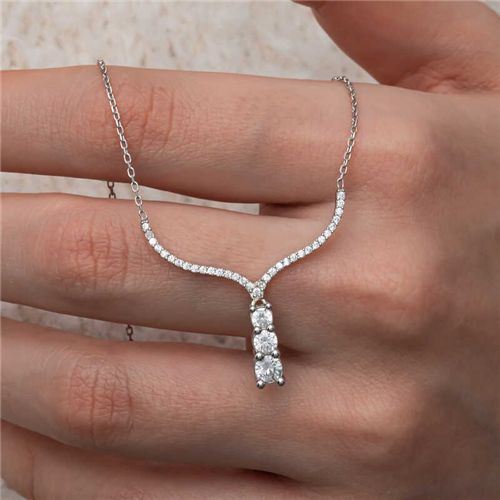 Silver Three Stone V Model Women's Necklace Three stones symbolize love, friendship and loyalty. The V model can be perceived as a symbol of balance and power; this expresses a person's inner strength and desire to stay in balance. This stylish necklace is a perfect option for a birthday gift, Valentine's Day or special occasions. The necklace is made of 925 sterling silver. Rhodium plated on the silver. Due to silver and precious stones, there may be ± 10% deviation from the average product weight. Width: 3.00 cm Length: 2.50 cm Avg. Weight: 3.00 gr. Chain Length: 45.00 cm