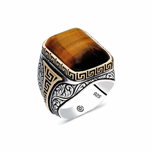 Silver Tiger Eye Stone Square Men's RingThis men's ring model made of Silver Tiger Eye Stone Square stone is a stylish accessory that you can use at any time of the day. You can gift this ring to yourself or your loved ones on your birthday, Father's Day or special occasions. Orange amber stone men's ring model is made of 925 sterling silver. Oxidized silver is coated. Oxidized silver men's rings preserve their shine for a long time. As with all men's rings, silver Orange Tightened Amber stone Square men's ring model is also handmade. Due to silver and precious stones, there may be ± 10% deviation from the average product weight.Average Weight: 17.00 gr.