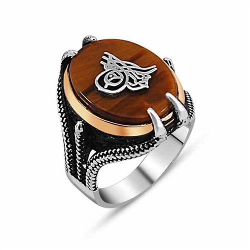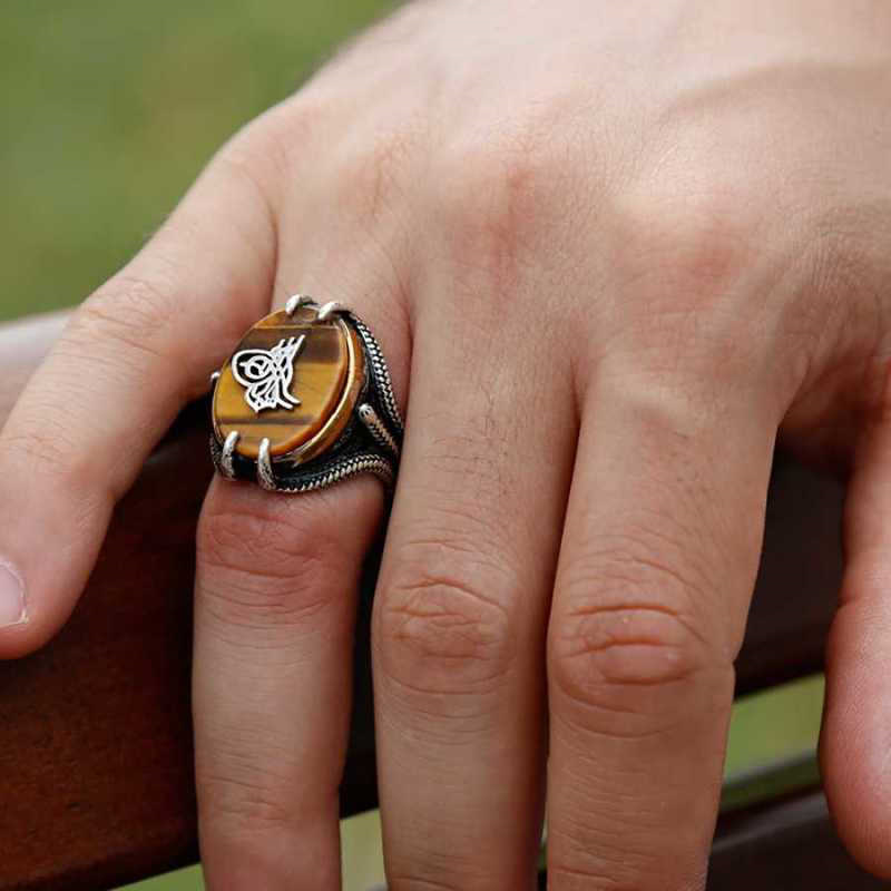 Silver Tiger's Eye Stone Tughra Men's RingTiger's eye stone, a quartz group, is one of the most valuable healing stones. When polished, it takes on a silky appearance. Tiger's eye is a stone with iridescent properties. It is often used as jewelry. Tiger's eye stone is known to be good for asthma. It also acts as a soothing agent in cases of digestive disorders. Tiger's eye stone is known as the stone of the Gemini zodiac sign. It is yellow with brown stripes. It is also known as the stone of independence. This is because it is believed that it makes those who wear it less dependent on other people. It reduces stubbornness, helps a person see things more clearly, and protects against the evil eye. It is beneficial for asthma patients. It reminds people who feel their life lacks purpose of their purpose. It can also enable telepathic communication with people you are in a relationship with. You can enjoy wearing this tiger's eye stone ring and gift it to your loved ones. It is made of 925 sterling silver. The silver is oxidized. Oxide-coated silver men's rings maintain their shine for a long time and delay tarnishing. The stone on them is tiger's eye. All of our silver tiger's eye rings and other products are handmade. Due to the silver and precious stones, product weight may vary by ±10%. Average Weight: 15.00 g.