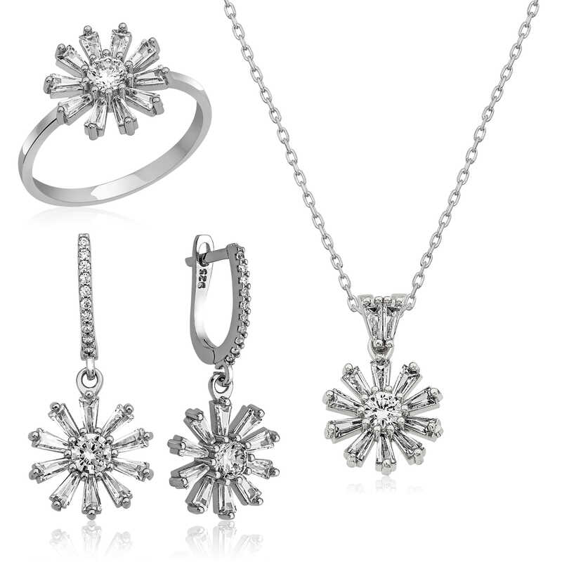 Silver Trapezoidal Stone Flower Lady SetWhy do you have a elegant set of floral patterned? This elegant set is one of the most beautiful ways that you can send to O at special times and enjoy your loved ones. The best quality, silver trapezoidal stone flower lady set prepared with most radiating stones; they want to tell their love once again, you are waiting for those who want to say a flower. This special design is made of silver flower lady set 925 sterling silver. Rodium coating on silver is made. The silver lady set models made of rodium coating keep brightness for a long time and the oxidization is delayed. The chain length with silver is 45 cm. As with all lady silver set models, silver trapezoidal stone flower lady set is also manufactured with hand labor. Due to silver and gemstones, the product specified can be ± 10% deviation. Width: 2.00 cm Size: 2.20 cmOrt. Weight: 10.00 gr.