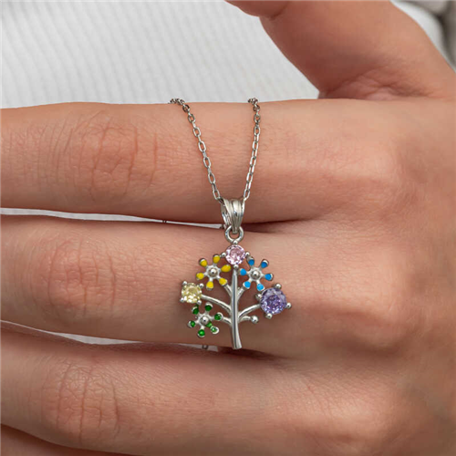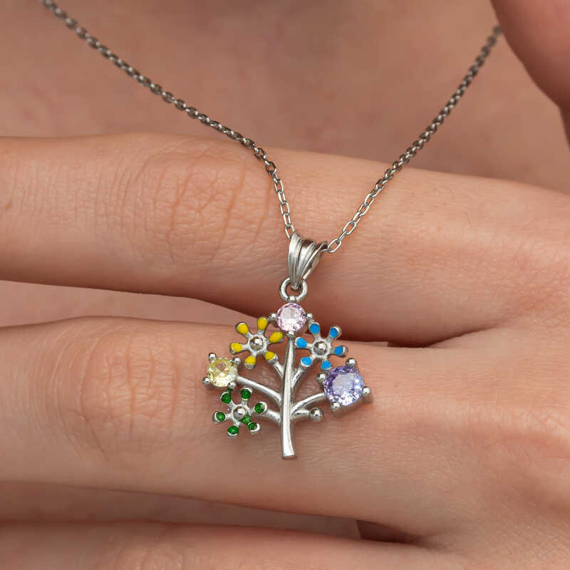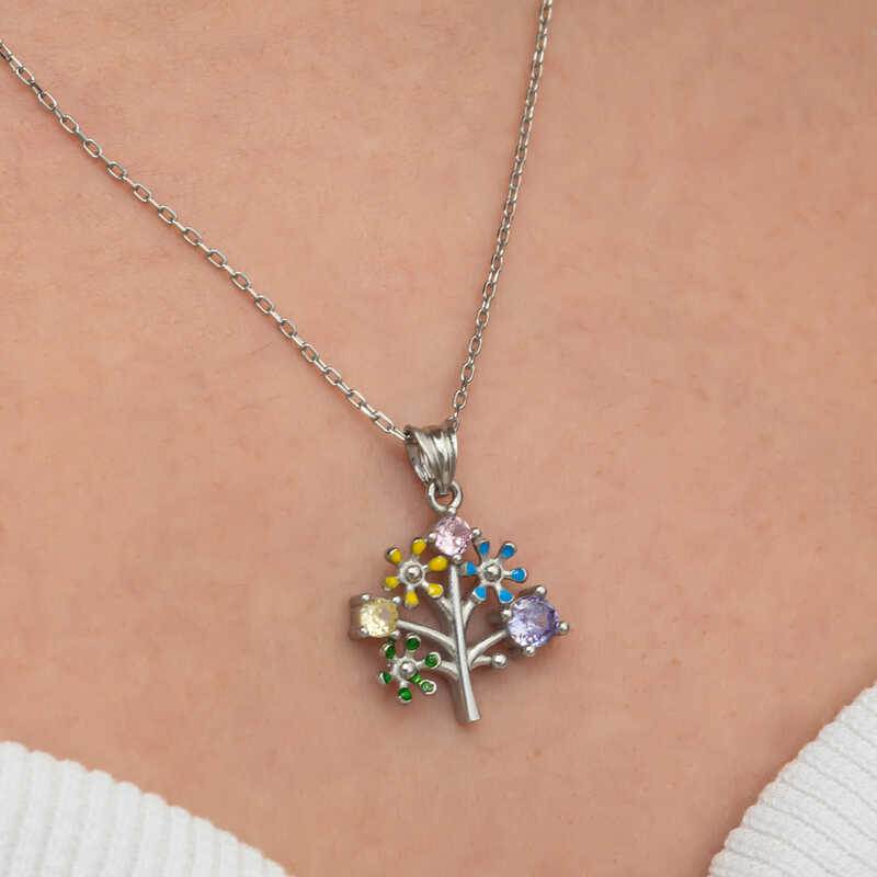 Silver Colored Tree of Life Women's Necklace Two tree of life motifs symbolize different aspects of life and family ties. The tree of life necklace decorated with colored zircon stones aims to add positive energy and joy to its wearer. It is a meaningful gift option especially for nature and life lovers. This stylish necklace is a perfect option for a birthday gift, Valentine's Day gift or on special occasions. Rhodium plated silver. Rhodium-plated necklaces preserve their shine for a long time and oxidation is delayed. Due to silver and precious stones, there may be ± 10% deviation in the average product weight. Width: 1.50 cm Length: 2.50 cm Avg. Weight: 3.50 gr. Chain Length: 45.00 cm