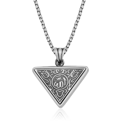 Silver Triangle Allah Inscribed Cevşen Prayer Necklace Religion is a system based on belief with a spiritual side. Allah is the absolute and only creator of the entire universe and all living and non-living beings. It is a special accessory that believers who hold these thoughts may want to carry and keep with them in their daily lives. This stylish necklace model will be a meaningful way to express spiritual feelings. This necklace with an elegant design will bring peace to you and your loved ones. The Cevşen Prayer necklace with the Arabic triangle Allah inscribed on it is made of 925 sterling silver. The silver is oxidized. Oxidized silver necklace models preserve their shine for a long time and oxidation is delayed. The average silver chain length is 55 cm. As with all silver necklace models, the silver triangle Allah written Cevşen prayer necklace model is also produced by hand. Due to silver and precious stones, there may be ± 10% deviation in the specified product weight. Product Length: 2.80 cm. Product Width: 3.20 cm. Chain Length: 55.00 cm. Average Weight: 12.00 gr.