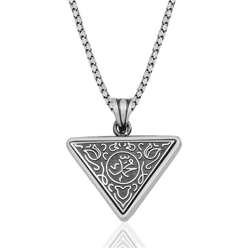 Silver Triangle Muhammad Inscribed Cevşen Prayer Necklace You can give your loved ones a meaningful and beautiful gift with a necklace with the name of the Prophet inscribed. Thus, you can make your loved ones happy with this silver openable triangle Muhammad inscribed Cevşen Prayer necklace, which has a religious and deep meaning. If you want to give a nice gift to the people you care about, this is an opportunity not to be missed. This stylish triangle Muhammad inscribed Cevşen Prayer necklace is made of 925 sterling silver. Oxidized silver is coated. Oxidized silver necklaces preserve their shine for a long time and oxidation is delayed. The average chain length is 55 cm. All of our products are handmade. Due to silver and precious stones, there may be a ± 10% deviation in the average product weight. Product Length: 2.70 cm. Product Width: 3.10 cm. Chain Length: 55.00 cm. Average Weight: 12.00 gr.