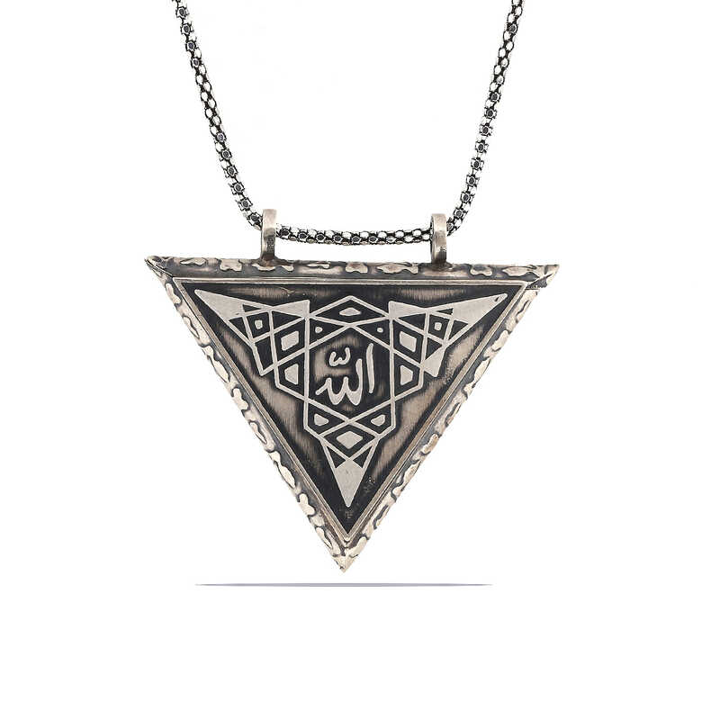 Silver Triangle Openable Allah Amulet Necklace Religion is a system based on belief with a spiritual side. Allah is the absolute and only creator of the entire universe and all living and non-living beings. It is a special accessory that believers who hold these thoughts may want to carry and keep with them in their daily lives. This stylish necklace model will be a meaningful way to express spiritual feelings. This necklace with an elegant design will bring peace to you and your loved ones. The Allah amulet necklace with an Arabic opening is made of 925 sterling silver. Oxidized silver. Oxidized silver necklace models preserve their shine for a long time and oxidation is delayed. The average silver chain length is 55 cm. Like all silver necklace models, the silver openable Allah amulet necklace model is also produced by hand. Due to silver and precious stones, there may be ± 10% deviation in the specified product weight. Product Length: 4.00 cm. Product Width: 4.50 cm. Chain Length: 55.00 cm. Average Weight: 19.00 gr.