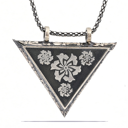Silver Triangle Openable Flower Amulet Necklace The most special and elegant way to express your feelings to your loved ones is to send them stylish, colorful and fragrant flowers. Flowers, which are among the gifts to be given on special occasions, have been designed with a different interpretation this time... This necklace created with spirituality is made of 925 sterling silver. The necklace is oxidized. Like other silver necklaces, the silver rose amulet necklace is produced entirely by hand. Due to silver and precious stones, there may be a ± 10% deviation in the average product weight. Product Length: 5.00 cm. Product Width: 6.00 cm. Chain Length: 55.00 cm. Average Weight: 28.35 gr.