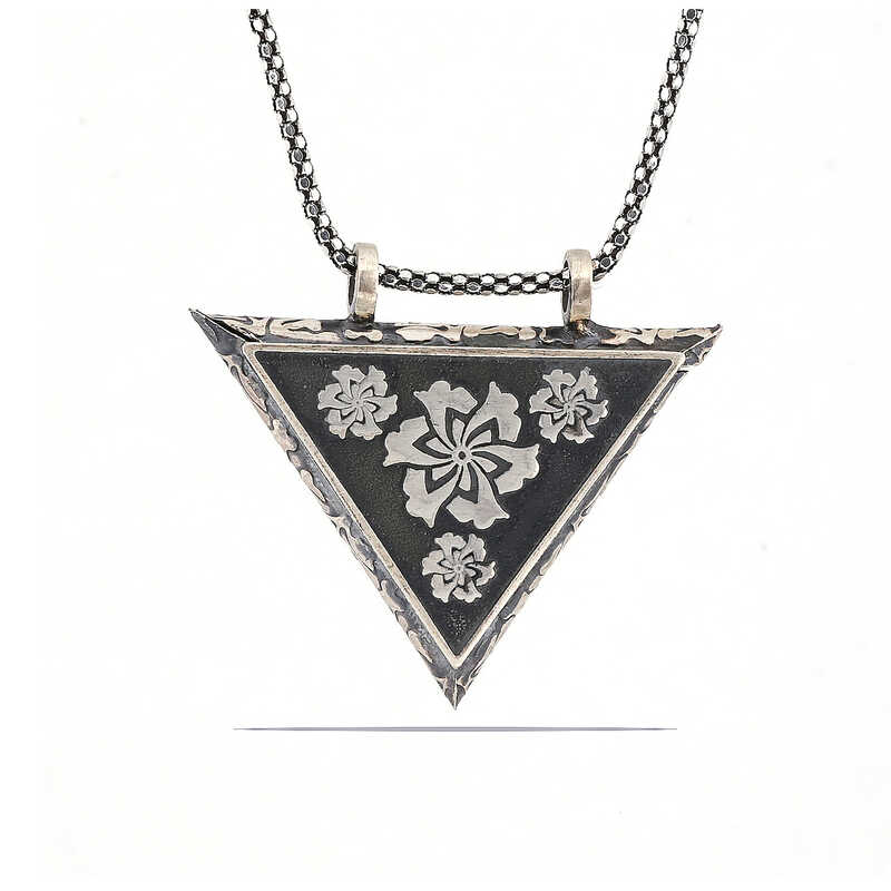 Silver Triangle Openable Flower Amulet Necklace The most special and elegant way to express your feelings to your loved ones is to send them stylish, colorful and fragrant flowers. Flowers, which are among the gifts to be given on special occasions, have been designed with a different interpretation this time... This necklace created with spirituality is made of 925 sterling silver. The necklace is oxidized. Like other silver necklaces, the silver rose amulet necklace is produced entirely by hand. Due to silver and precious stones, there may be a ± 10% deviation from the average product weight. Product Length: 4.00 cm. Product Width: 4.50 cm. Chain Length: 55.00 cm. Average Weight: 21.00 gr.