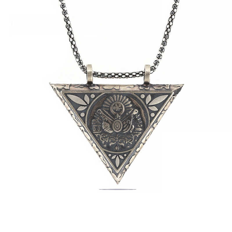 Silver Triangle Openable Ottoman Coat of Arms Amulet Necklace The State Coat of Arms of the Ottoman Empire was prepared for the Ottoman Empire in the 19th century. Before that, the tughras of the sultans served as state decorations. The final version of the Ottoman decoration was enacted by Sultan Abdulhamid II in 1882. There are two flags inside the Ottoman State Decoration. The flag with the crescent and star on a red field symbolizes the Ottoman Dynasty, while the flag on the green field symbolizes the Islamic caliphate. The scales represent Ottoman justice, and the books on the scales represent the Ottoman laws and the Quran, which are the source of justice. The necklace created with this spirituality is made of 925 sterling silver. The necklace is oxidized. Like other silver necklaces, the silver Ottoman Arms amulet necklace is entirely handmade. Due to silver and precious stones, there may be ± 10% deviation from the average product weight. Product Length: 4.00 cm. Product Width: 4.50 cm. Chain Length: 55.00 cm. Average Weight: 20.35 gr.