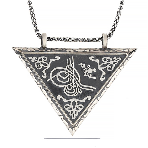 Silver Triangle Openable Tughra Amulet Necklace Tughra means the signature of the Ottoman sultans. Each tugra expresses the name, existence and reign of the sultan it belongs to. The tugra symbol has survived to the present day in many forms, different for each sultan. The tugra was preserved in every period of the Ottoman Empire and never lost its importance. And over time, it has an important place in our calligraphy, and is kept alive artistically by calligraphers today. The necklace created with this spirituality is made of 925 sterling silver. The necklace is oxidized. Like other silver necklaces, the silver tughra amulet necklace is produced entirely by hand. Due to silver and precious stones, there may be a ± 10% deviation in the average product weight. Product Length: 5.00 cm. Product Width: 6.00 cm. Chain Length: 55.00 cm. Average Weight: 32.35 gr.